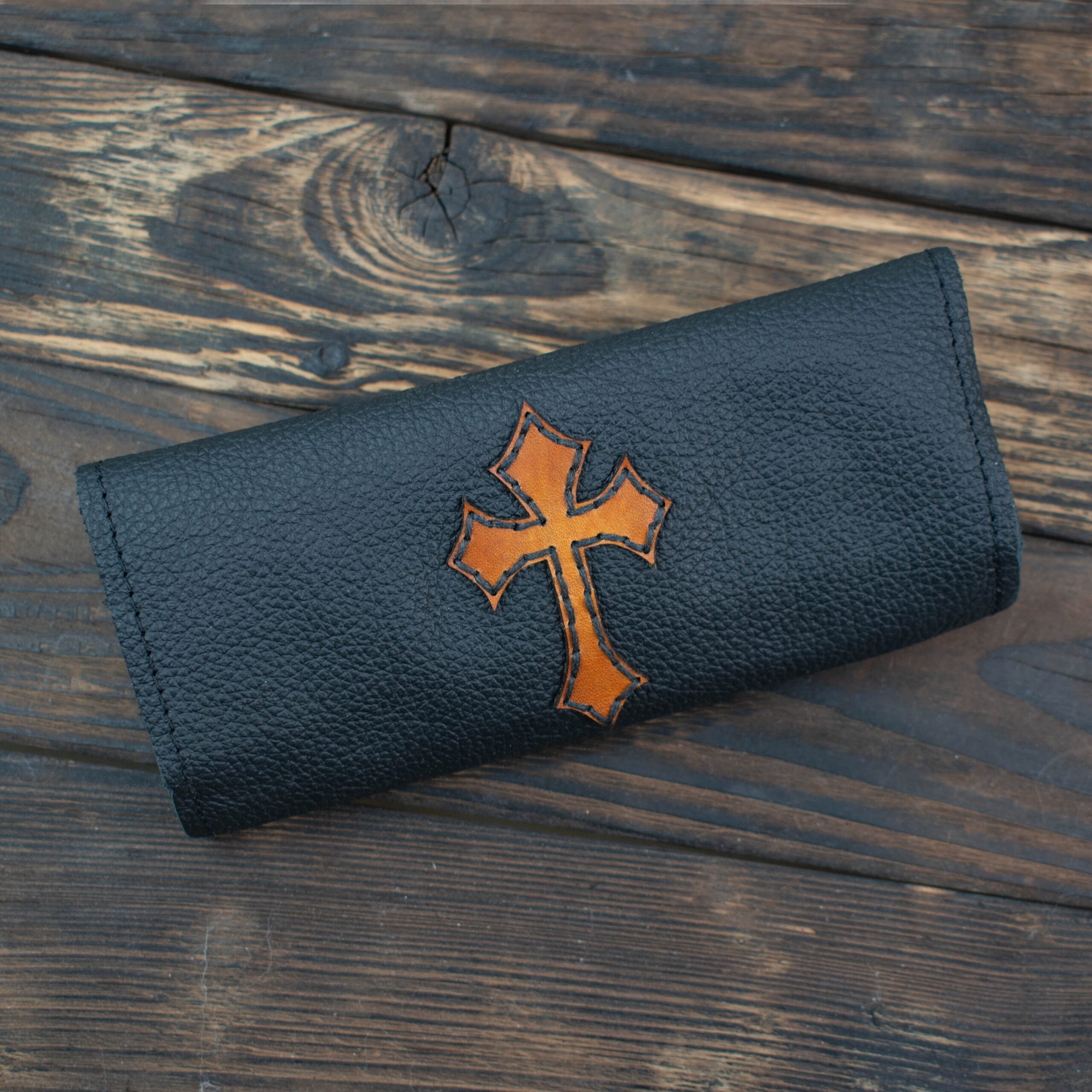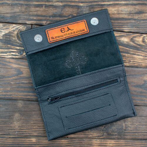 Αυτή η καπνοθήκη είναι κάτι παραπάνω από ένα αξεσουάρ· είναι ένα προσωπικό αντικείμενο φτιαγμένο για να αντέχει στον χρόνο. Χρησιμοποιούμε ποιοτικό μαύρο δέρμα με ανάγλυφη υφή, ενώ ο χαρακτηριστικός σταυρός σε ταμπά απόχρωση και κάθε λεπτομέρεια είναι ραμμένα εξ ολοκλήρου στο χέρι με κερωμένη κλωστή για μέγιστη αντοχή.