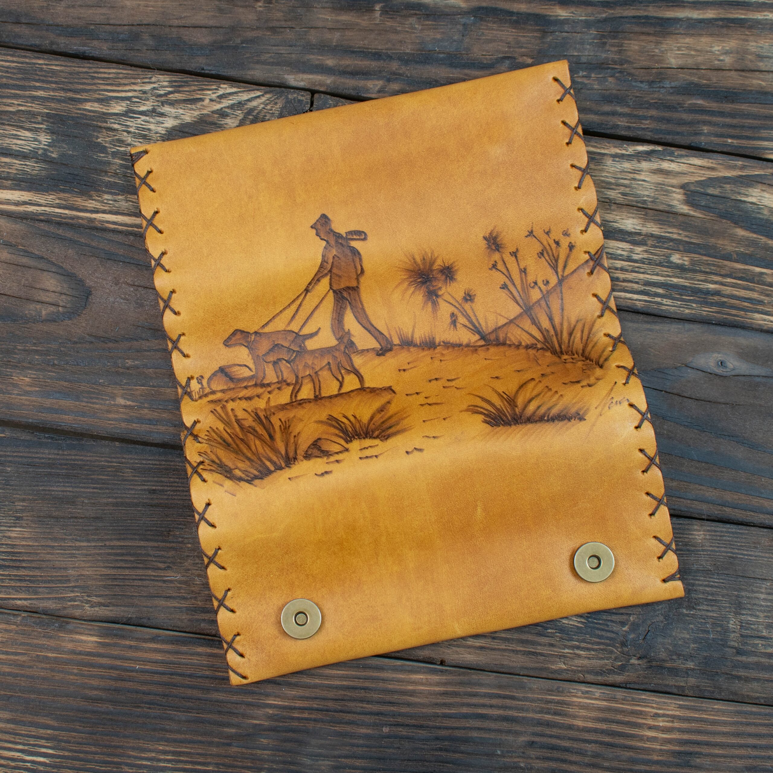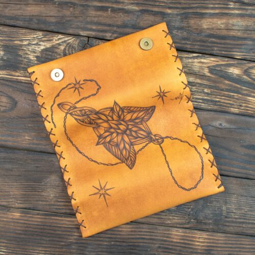 Θα είναι ένα κομμάτι τέχνης, φτιαγμένη από φυσικό δέρμα και εμπνευσμένη από το δικό σου γούστο. Κάθε κομμάτι είναι μοναδικό και δουλεμένο με μεράκι και φροντίδα καθώς η εικονογράφηση γίνεται στο χέρι με τη μέθοδο της πυρογραφίας.